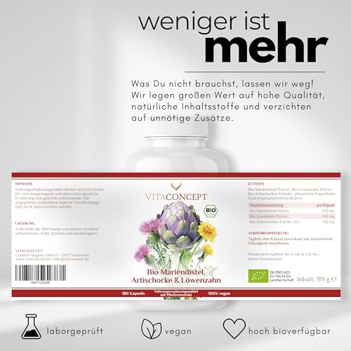 Gönnen Sie sich das Beste für Ihre Gesundheit und profitieren Sie von unserem exklusiven BIO Mariendistel Artischocke Löwenzahn Komplex I. Bestellen Sie jetzt und erleben Sie die Kraft reinster Pflanzenextrakte in einer hochdosierten, veganen Form. Für mehr Vitalität, Wohlbefinden und eine nachhaltige Unterstützung Ihres Körpers – vertrauen Sie auf die Qualität von Vitaconcept.
